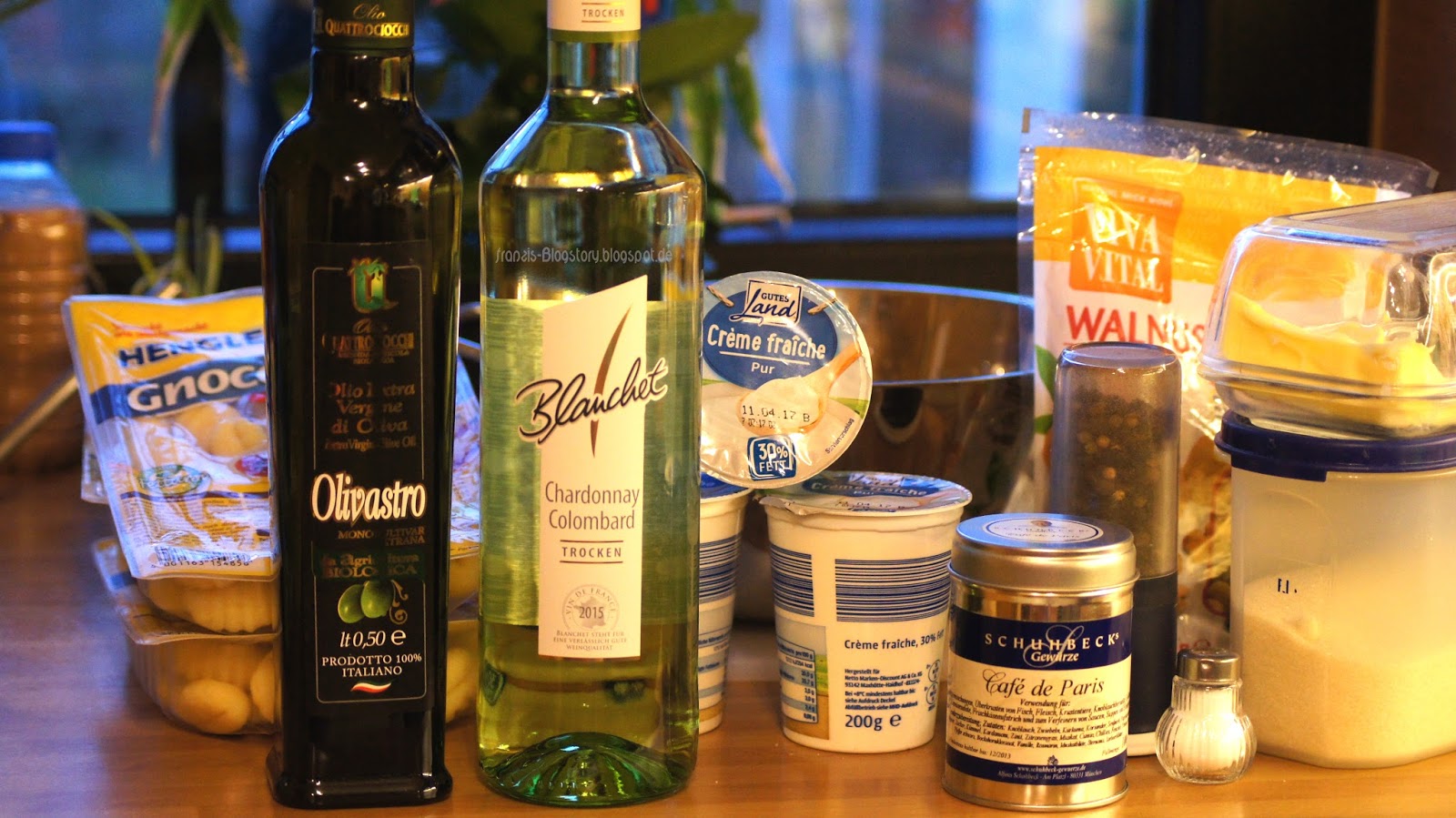 In die selbe Pfanne in der die Walnüsse karamellisiert wurden gebt Ihr nun etwas Öl – vorzugsweise Olivenöl für den Geschmack – den Weißwein sowie Butter und lasst das Gemisch aufkochen bevor Ihr die Crème fraîche hinzufügt.